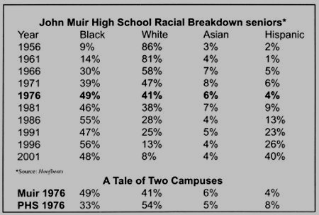 Following in the sizable wake of the La Canada exodus, white parents in the affluent San Rafael and Linda Vista areas of Pasadena protested that their babies deserved to be at the brand new high school in "nearby" La Canada and not at the still overcrowded and quickly deteriorating Muir. When the powers that be rejected their request outright, many parents moved within the La Canada school district or put their children in private school, or worse, lied about their addresses to make sure their kids attended La Canada High. The upshot was that overnight the face of Muir was irreversibly changed.